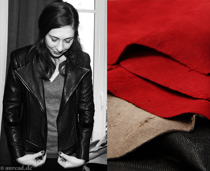 Armance selbst ist eine ihrer besten Kundinnen. Meist trägt sie eine schlichte schwarze Bikerjacke, darunter einen Hoodie. “Jacken sind wie Accessoires”, findet sie. Für jede Gelegenheit gibt es die richtige. Auch an diesem Tag trägt sie ihre schwarze Biker-Jacke aus festem Leder, dann eine apricotfarbene, eine rote und eine blaue – nach vier Stunden hat sie fast alle  Modelle einmal durch. Armance Rotceigs-Jacken erkennt man an den Streifen an den Ärmeln, die je nach Modell variieren. Die Bikerjacke „Saskia“ –benannt nach ihrer Schwester – und das Jacket „Scarlett“ haben je nur einen Streifen am Ärmel, der Blazer „Mandane“ mit andersfarbigem Revers-Krage drei Streifen. Streifenlos, aber dennoch sehr hübsch, da so schlicht, ist das ärmellose Jäckchen „Carmen“.