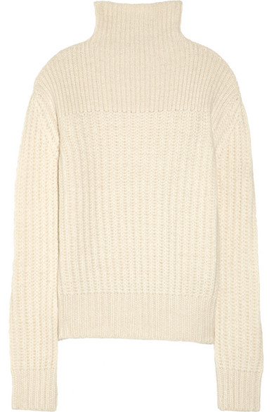 Acne “Cypress” Ankle-Boots, mytheresa.com// The Row “Hunston” chunky-knit alpaca and silk-blend turtleneck sweater,net-a-porter.com // Statment-book: “Lotta” by Astrid Lindgren, amazon.de// Acne low-rise cropped boyfriend jeans, matchesfashion.com//Day Birger et Mikkelsen’s knitted coat, net-a-porter.com // Nars lip gloss colour “wonder”, beauty.com // Cos socks