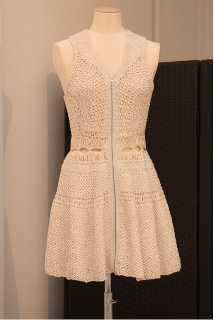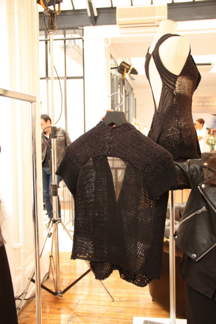 For the coming summer-season she used a lot of technical yarn and paired loose knits with fabrics like silk-organza, mousseline and linen. Voilà, some snapshots: